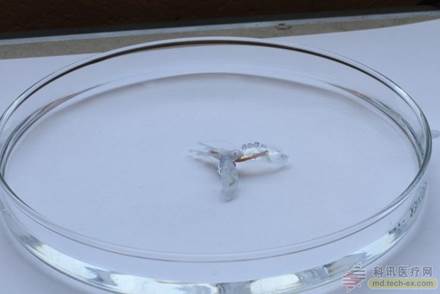 另外一些研究者从自然中汲取灵感,打造生物驱动的生物混合机器人。例如,来自加州理工学院的一支研究团队从水母中得到灵感,开发了一款生物混合机器人。研究团队将这款机器人称为“水母类机器人”,它有着能够绕城圆圈的手臂,他们称之为“水母机器人”,它的周围安装了一圈手臂,每条手臂都用蛋白质材料刻印了微型模型,就像活体水母的肌肉一样。当细胞组织收缩的时候,这些手臂就会向内弯曲,推动生物混合机器人在富含营养物质的液体中向前移动。