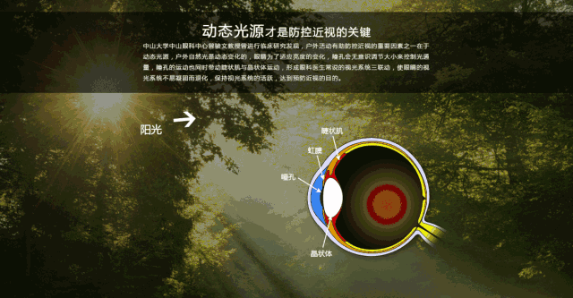 由此,引发了科学家对模拟动态光源技术的关注。中山大学中山眼科中心的研究团队在动物实验中发现,相比室内的静态光源,室外的自然光源有着光的动态变化,光的动态变化能够让瞳孔放大和缩小,也能够让睫状肌紧张和放松。也就是说,理论上,动态光可以实现调节训练的作用。