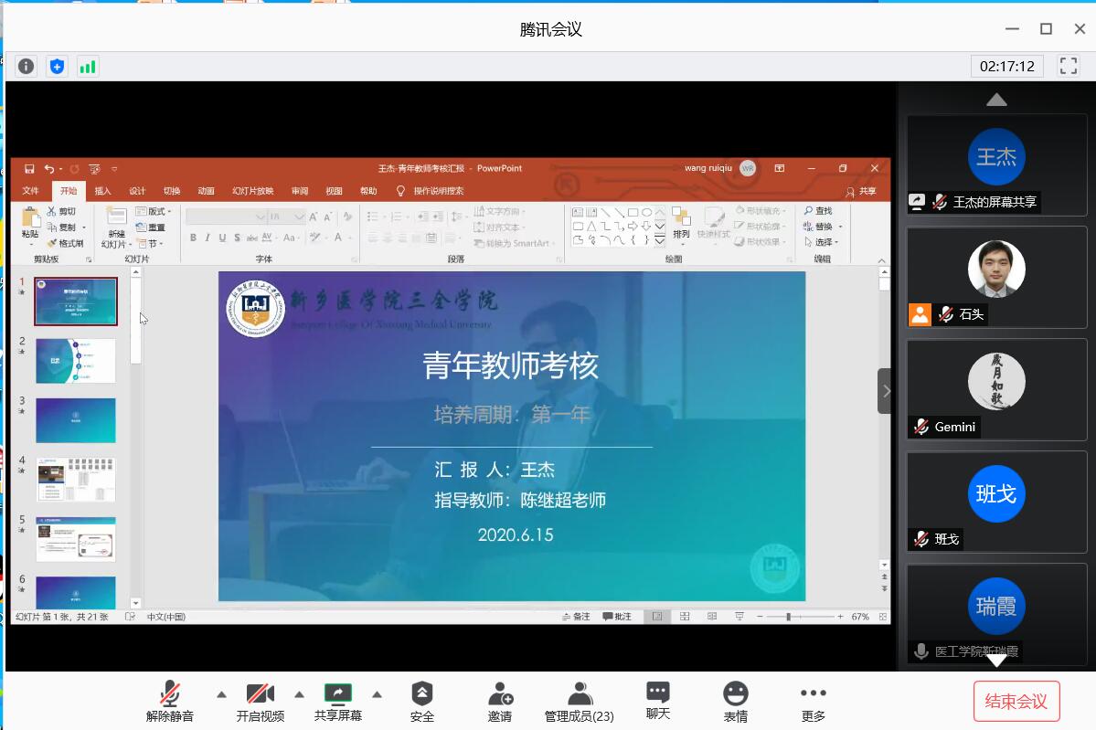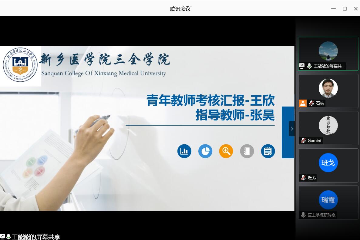 2020年6月15日上午9:30分,智能医学工程学院召开2019-2020学年青年教师及指导教师考核会议,会议在腾讯会议线上平台召开,评委由智能医学工程学院党总支副书记兼副院长陈继超、行政副院长班戈、副教授靳瑞霞担任。出席会议的有青年教师17人,青年教师指导教师11人。