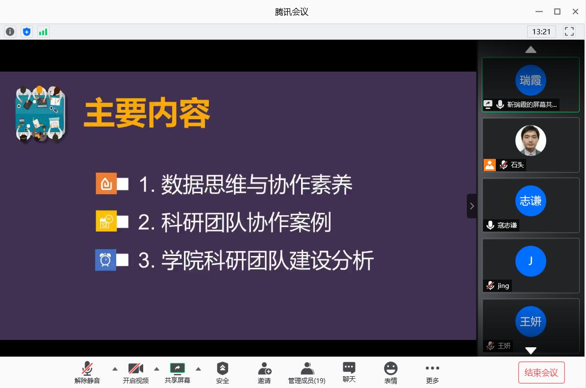 本次经验介绍以“科研团队协作素养的效用及养成路径探讨”为主题,旨在帮助教师解决科研团队建设、科研团队课题申报等突出问题,提高科研成果输出数量,推动学院科研团队工作热情为主要目的。