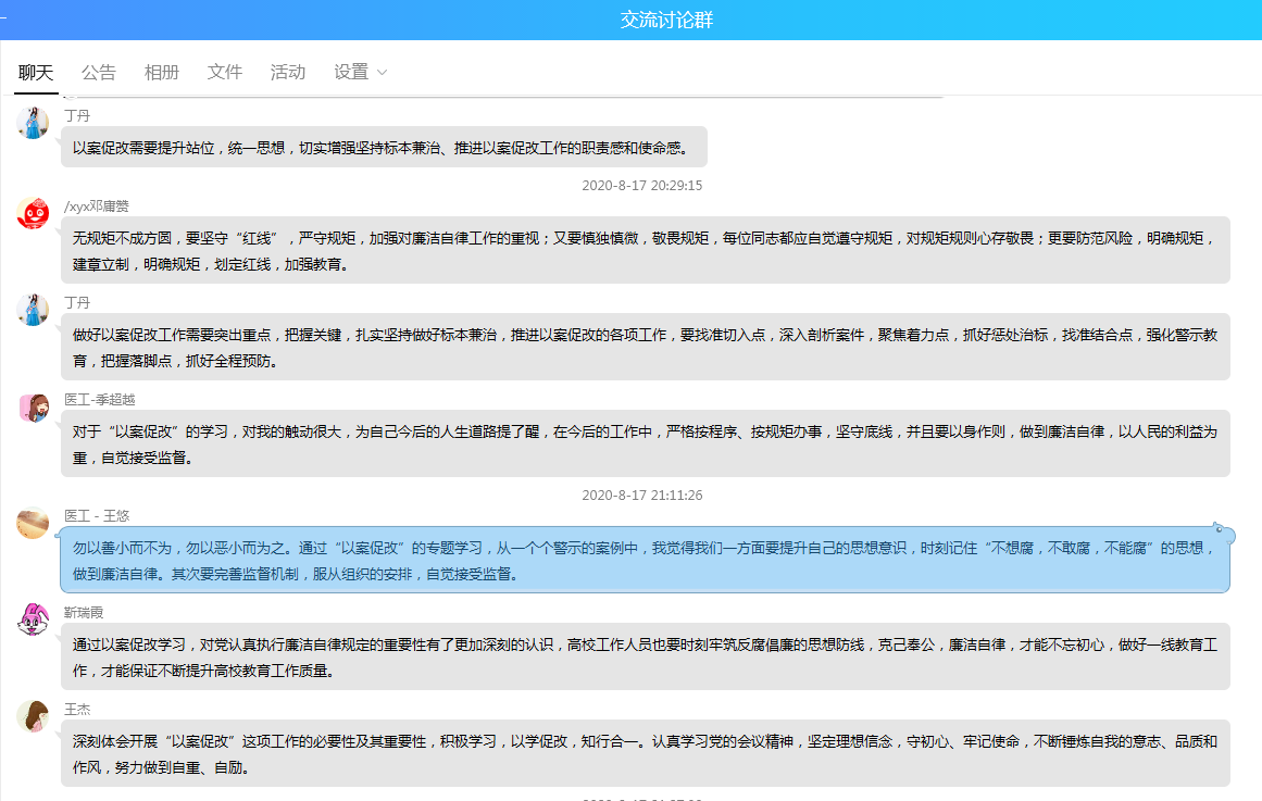 区分两个支部,采取党员带群众的方式,围绕10起违纪违法案件和学校发生的案例,召开以案促改专题学习讨论会,深入开展学习讨论,搞好对照反思,从中汲取教训,并如实填报《单位(组织)以案促改专题学习讨论会发言情况记录表》。智能医学工程学院党总支共组织了3场学习讨论,36人次参加,29人撰写了学习体会。