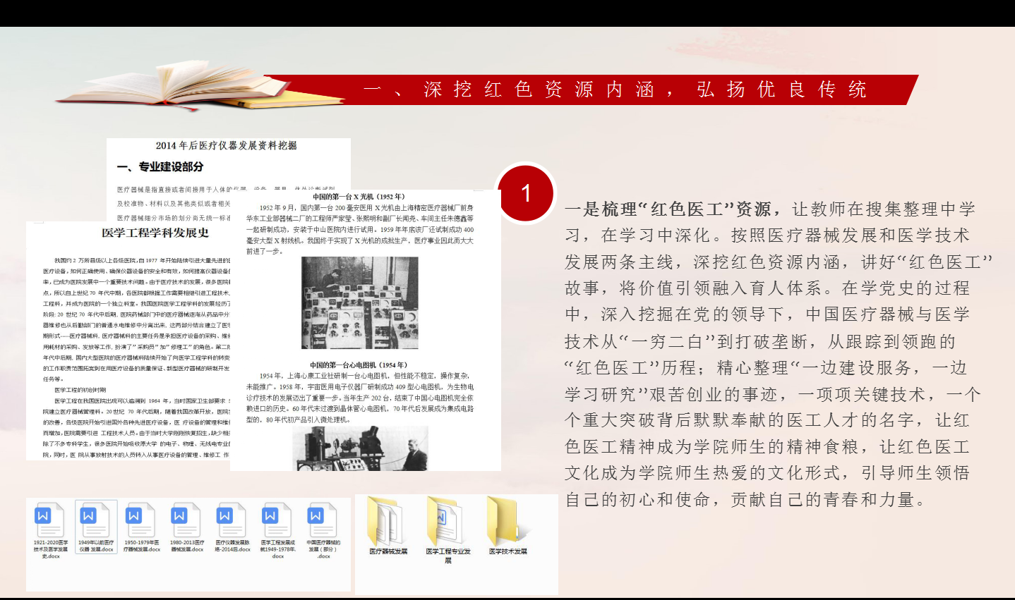 一是“红色医工”资源梳理。按照医疗器械发展和医学技术发展两条主线,区分智能医学支部和医学工程支部,深入开展红色医工资源挖掘整理工作。发挥学校主阵地作用,深挖红色资源内涵,讲好“红色医工”故事,将价值引领融入育人体系。在学党史的过程中,深入挖掘在党的领导下,中国医疗器械与医学技术从“一穷二白”到打破垄断,从跟踪到领跑的“红色医工”历程;精心整理“一边建设服务,一边学习研究”艰苦创业的事迹,一项项关键技术,一个个重大突破背后默默奉献的医工人才的名字;总结回顾改革开放的春风推动医工加速发展的脚步,发现开启数字化、智慧化模式,达到世界先进水平的自由之路。先后整理了图片资料100多张,文献资料40多页,梳理了《医学工程学科发展史》,《中国医疗器械的发展史(部分)》等资料,让红色医工精神成为学院师生的精神食粮,让红色医工文化成为学院师生热爱的文化形式,引导师生领悟自己的初心和使命,贡献自己的青春和力量。