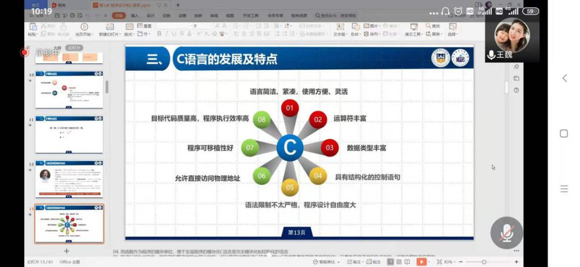王魏老师围绕《C语言程序设计》进行预试讲。寇志谦老师建议,从语言发展直接到计算机语言有点突兀,学生不知道跟程序有什么关系。机器语言是16进制,讲的二进制就用二进制。程序设计讲解要具体,反斜杠要说明,输入输出的内容可以精简,注释举例说明就行。