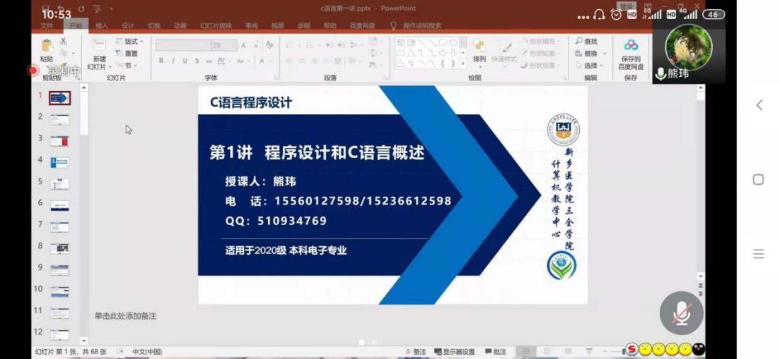 熊炜老师围绕《程序设计和C语言概述》进行了预试讲。朱云峰老师指出,幻灯片有点多,用时太长,如果线上讲不完会堆积内容。实验从第一周就开始,不能把所有精力放到理论课上,要对实验进行设计,21号以前课件要做到两讲。寇志谦老师建议,习题先给学生,线上课每道题都讲。举例子时,学生接触的第一个程序要仔细讲,第二个引入变量,第三个讲调用函数,可以给学生讲,我们自己编写一个max函数来完成这样的功能,具体函数内语句后面的课程会讲。副院长靳瑞霞指出,一是实验课和理论课是分开组织的话,68张幻灯片,即使在教室上课也比较多,后面流程图\NS图,要提前调整好,内容精简一下,难易度把握循序渐进。二是举例说明的时候,点选幻灯片的方式容易让学生搞不清头绪,授课方式要调整一下。三是实验课要做好准备,内容和寇志谦老师沟通。