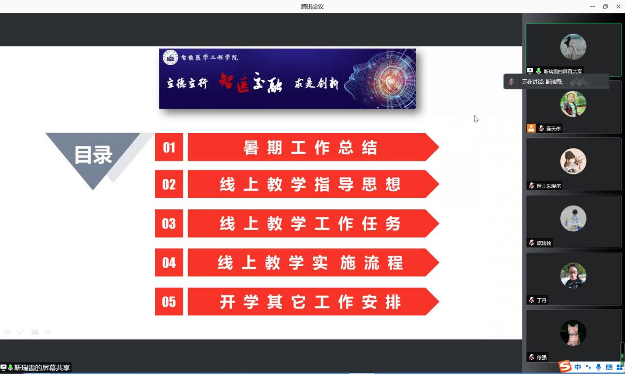 8月23日,为扎实准备好2021-2022学年第一学期各项工作,智能医学工程学院召开线上会议,对新学期工作进行筹划部署。会议由副院长班戈主持,副院长靳瑞霞进行了讲评和工作安排,副书记陈继超做了强调,全体人员参加。