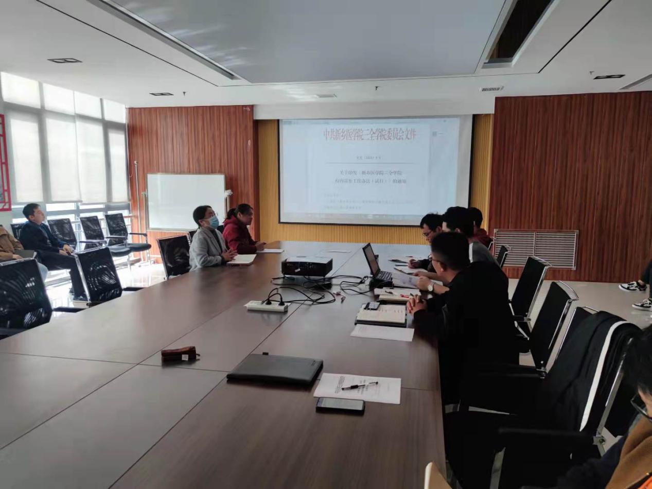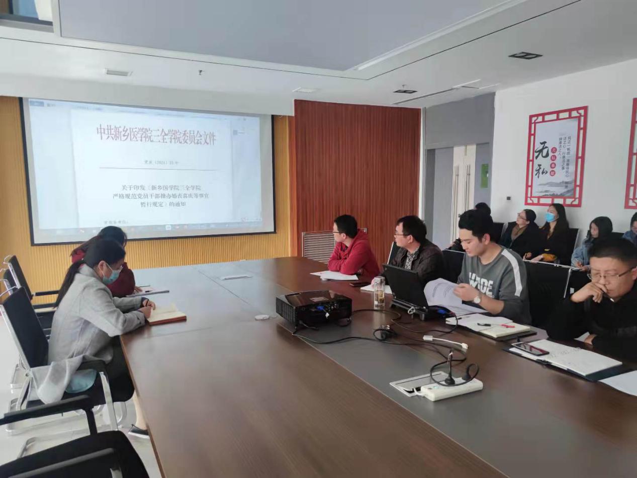 邓庸赞传达学习了《新乡医学院三全学院校内巡察工作办法(试行)》《新乡医学院三全学院关于运用监督执纪“第一种形态”的实施办法(试行)》《新乡医学院三全学院严格规范党员干部操办婚丧喜庆等事宜暂行规定》。并对工作落实提出要求。