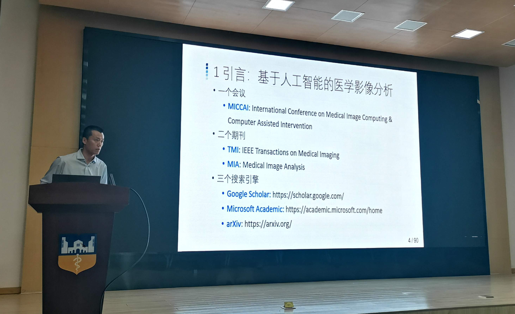 智能医学工程学院副院长靳瑞霞致欢迎词,简要介绍了申华磊博士的基本情况,并对申华磊博士表示热烈欢迎。她指出,随着计算机技术及人工智能技术的发展,AI助力构建人类命运共同体的建设和可持续发展,越来越成为世界各国备受关注的前沿问题之一。十三五以来,我国人工智能产业发展迅猛,政策环境持续优化。截止2020年,我国连续4年将人工智能写入政府工作报告,出台人工智能相关政策10余项,其中《促进新一代人工智能产业发展三年行动计划》、《高等学校人工智能创新行动计划》等政策,驱动人工智能创新能力不断提升。在新冠疫情防控期间,人工智能技术产品形成“智能抗疫军团”,特别是智能影像诊断技术的应用,有力支撑了疾病确诊和疫情防控。基于此背景,特邀请到河南师范大学人工智能系的主任申华磊博士,做智能医学影像相关专题讲座,希望能够通过讲座能为我校师生带来启示。