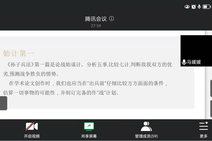 马媛媛为本次讲座做了充分的准备,从去年10月份至今,四个多月整理出一套《学术论文写作兵法》,包含“谋改篇”、“练兵篇”、“作战篇”和“精神篇”四个环节,共计三十六个“兵法”,并在讲座上将“谋改篇”和“练兵篇”倾囊相授。谋改篇”共分为十个“兵法”:始计第一、文献第二、调研第三、选题第四、综述第五、编程第六、创新第七、实验第八、分析第九和讨论第十。马媛媛说在学术论文创作时,我们也应当在出兵前仔细比较方方面面的条件估算一切事物的可能性,并制订完备的作战计划,确定关键词,查阅丰富的文献,洞察同行,明确选题,全面把握国内外相关研究进展,在编程中搞清典型方法原理、理清细节,用创新方法出奇制胜,并通过研讨、交流等方式对新思想进行讨论和修正。“练兵篇”也分为十个“兵法”,马媛媛强调,标题是指挥棒,摘要阐述方法原理和创新点,引言反应水平,正文结构要安排合理,结论要总结全文,文献要全面规范,图表清晰直观,文中的引用和参考文献要一一对应,翻译要精准专业,最后的排版要整洁、清晰、美观、正规。