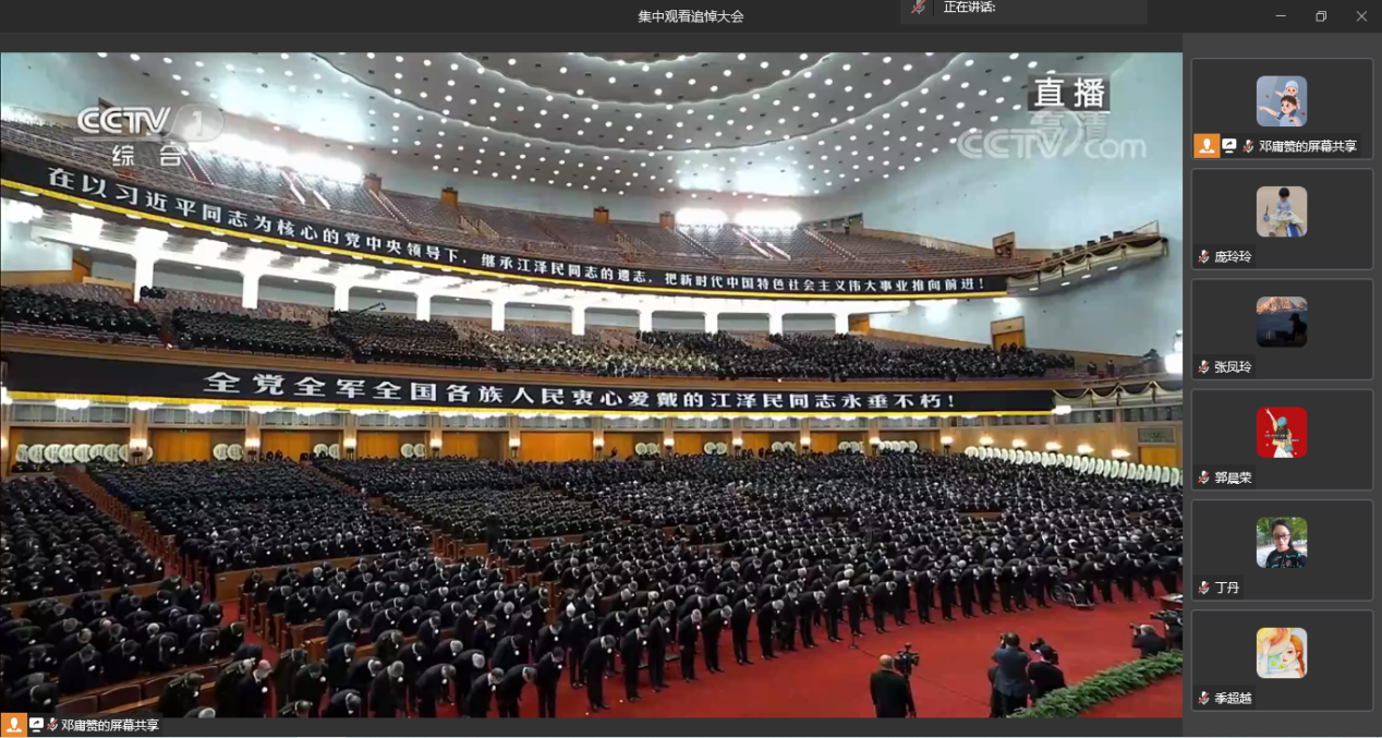 12月6日上午10时,党中央、全国人大常委会、国务院、全国政协、中央军委在北京人民大会堂隆重举行江泽民同志追悼大会。智能医学工程学院副院长靳瑞霞、副院长班戈,党总支副书记陈继超及全体教师在线上集中收看大会,并表示了沉痛的哀悼。
