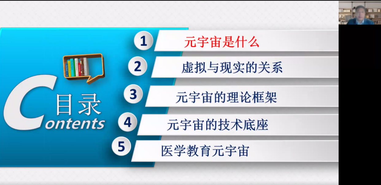 娄岩院长(教授)以“元宇宙与医学教育”为题,首先向与会人员介绍了元宇宙的概念、来源、发展。继而介绍了虚拟与现实的关系、元宇宙的理论框架和技术底座。接下来,娄教授着重从医学教育元宇宙协作学习、自由创造式学习、深度沉浸的体验式学习、因材施教个性化学习四个方面介绍了:元宇宙是如何通过场景赋能提升学习过程的沉浸感、协作性与创造性;元宇宙如何为医科院校构建虚实融生的医学教育形态提供了更富现实感的实践平台;以及元宇宙赋能医学教育的实施方案和发展前景。