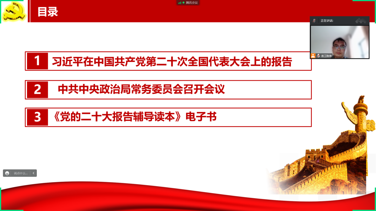 会议上,首先,党总支由学习委员陈坤带领中心组成员对“习近平:高举中国特色社会主义伟大旗帜为全面建设社会主义现代化国家而团结奋斗——在中国共产党第二十次全国代表大会上的报告”、“中共中央政治局常务委员会召开会议 听取新冠肺炎疫情防控工作汇报 研究部署进一步优化防控工作的二十条措施 中共中央总书记习近平主持会议”、“《党的二十大报告辅导读本》电子书”三项内容进行了集中学习,重点学习了宣传贯彻党的二十大精神中关于高等教育方面的重大论述,中心组成员深刻认识到: 教育是国之大计、党之大计。习近平总书记所作的党的二十大报告,通篇贯穿习近平新时代中国特色社会主义思想,描绘了全面建设社会主义现代化国家、实现第二个百年奋斗目标的宏伟蓝图,是我们党开启新时代新征程的政治宣言和行动纲领。报告从“实施科教兴国战略,强化现代化建设人才支撑”的高度,对“办好人民满意的教育”作出专门部署,凸显了教育的基础性、先导性、全局性地位,彰显了以人民为中心发展教育的价值追求,为推动教育改革发展指明了方向。