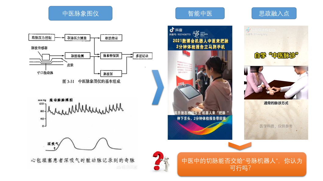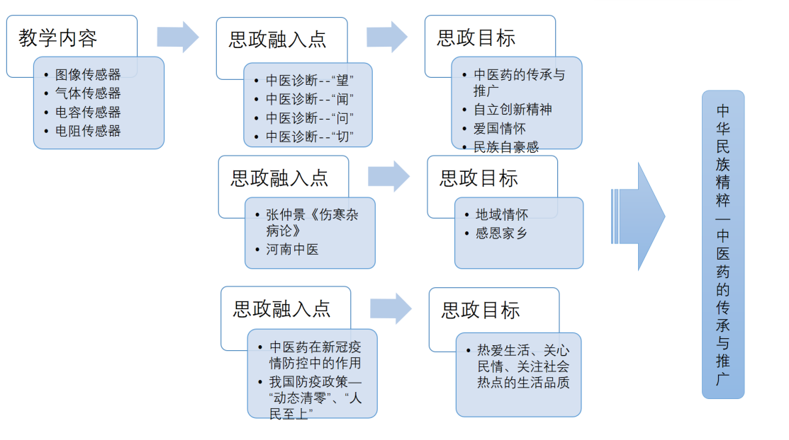 通过中医文化的传承增强学生的爱国情怀和民族自豪感;通过中医诊断方法与传感器的结合,培养学生拓展思维和自立创新的精神;通过“医圣”张仲景《伤寒杂病论》和河南中医的地位,培养河南地域情怀,感恩家乡;通过中医在疫情防控中的突出表现及我国“动态清零”“人民至上”的防疫政策,培养学生热爱生活、关心民情、关注社会热点的品质。