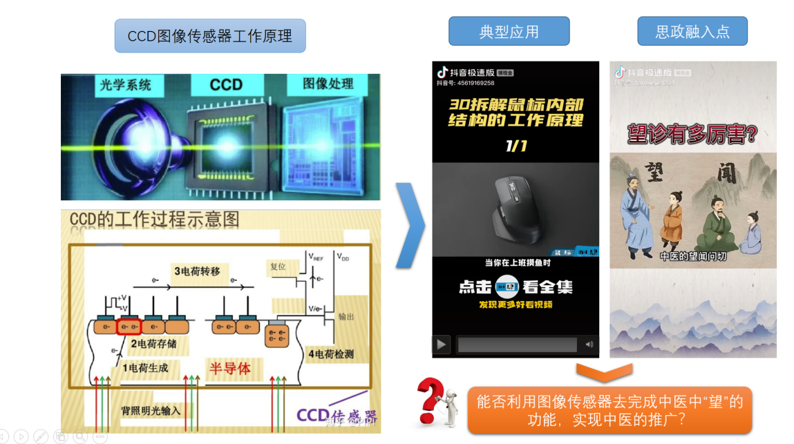 在讲CCD图像传感器时,先通过摄像头监控的实例说明CCD在监控中的作用,再通过问题引导的方式讲解图像传感器的工作原理,图像传感器是利用光电器件的光电转换功能将感光面上的光像转换为与光像成相应比例关系的电信号。然后引入思政内容--中医中“望”的含义:望,指观气色,对病人的神、色、形、态、舌象等进行有目的的观察,以测知内脏病变。比如看眼睛是否有神,眼白是否有异常,舌头是否过红,舌苔是否过厚等等,这项大量的工作就可以交给视频系统,通过CCD图像传感器获取图像,然后进行图像处理获取特征值,进而做出判断。思政元素与CCD专业知识的融合如图4所示。