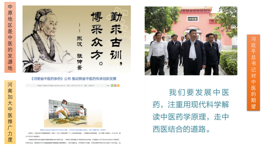 河南作为中医药学的重要发祥地和医圣张仲景的故乡,历代名医辈出,战国名医扁鹊、三国神医华佗、唐代名医孙思邈等,皆长期在中原行医立说而享誉四方;东汉伟大的医学家张仲景所著《伤寒杂病论》,开创了辨证论治之先河,形成了完整的中医诊疗体系;金元名医张从正、清代医学家吴其浚等医学泰斗,都出生成长于中原大地,中原地区中医药的发展如图7所示。通过对河南中医药的学习,增强学生的区域情怀,感恩家乡。
