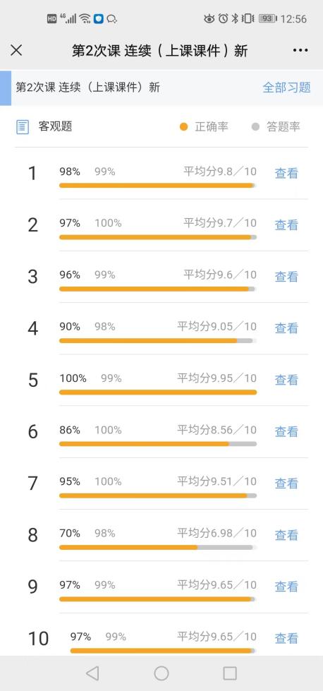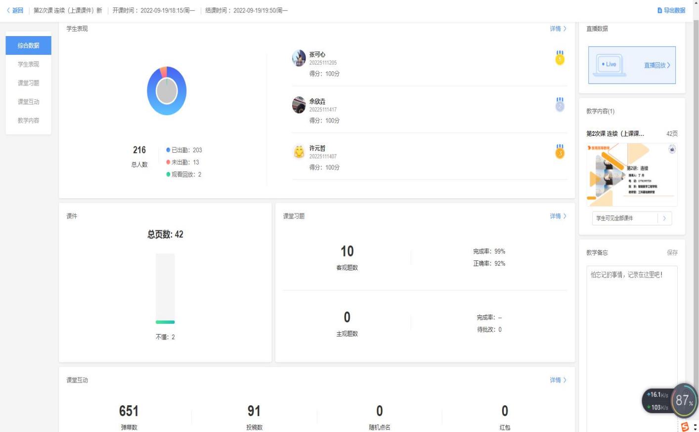 下面以2022级临床9-16班学生的第2次授课为例,介绍一下各相关的教学数据:课前发布了预习课件、重难点讲解视频,课前自测题目,第2次预习提示。课中进行长江雨课堂平台进行直播授课:课中的弹幕互动达到了651条,主观题目的投稿达到了91条,课中客观题的互动总共有10道题目,课中针对学生反应的不懂页码的课件进行着重讲解和强调。课后通过两道线上主观题作业的求解加深学生对课中内容讲授的理解和掌握。作业全部进行手动一个一个进行批改,针对个别有问题的同学,全部进行“一对一”的单独辅导和解答。