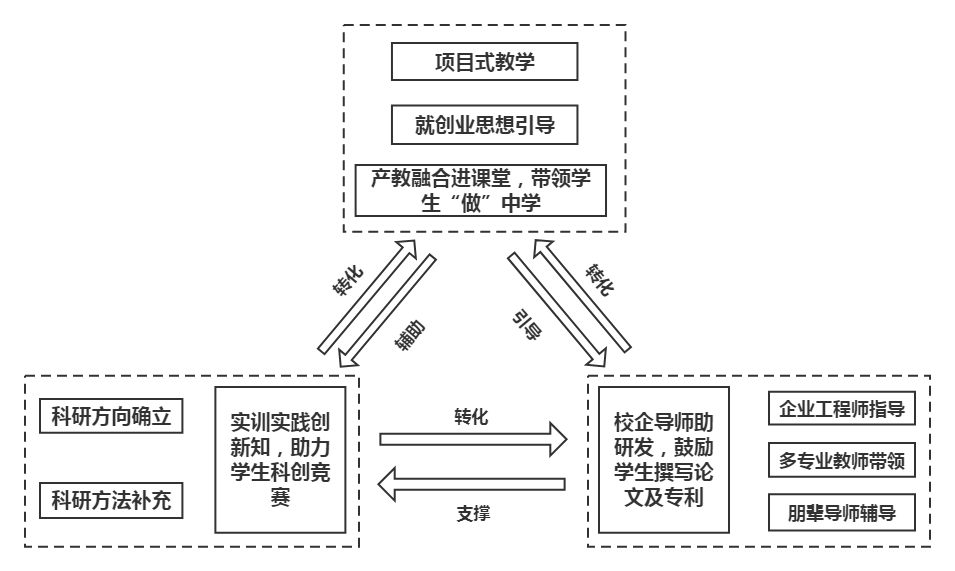 现阶段,高校学生具有强理论轻实践、书面知识扎实、动手能力较差、创新力不足的显著特点,这一点在学生科研竞赛方向体现尤为明显。学生科研素养不足,无法及时发现实际问题,为学生升学就业造成了严重阻碍。基于此种现象,各大高校均出台相关政策扶持学生科研。然而,部分高校采用学习讲座的形式培养学生的科研素养,此做法劳而无功,多数学生无法从中获得认同感,从而出现教师付出无收获、学生问题无解决的两难局面。为解决这一问题,本文拟采用产教融合进课堂、实训实践创新知、校企导师助研发三大模块进行设计,开展产教融合视域下基于“做创研”三位一体的高校学生科研模式探究。