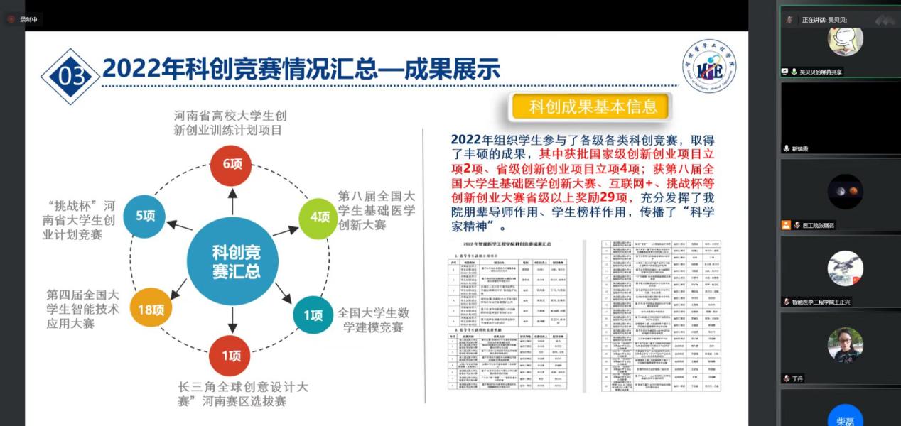 按照《河南省教育厅办公室关于开展本科高校“课堂教学质量提升年专项行动”情况调研的通知》(教高函〔2022〕686号)文件要求,为全面提升教学质量,落实学院“教学质量提升年”年度工作重心,规范教学运行、优化专业建设与课程建设,结合智能医学工程学院工作实际,我院于2023年1月12日上午召开了2022年度智能医学工程学院竞赛、督导、专业、学业导师等负责人工作总结暨2023年工作计划专题工作会议。会议采取腾讯会议线上平台进行,学院副院长靳瑞霞、班戈,学院竞赛、督导、专业、学业导师等负责人,各归口工作秘书,教研室、实验室主任参加了会议,会议由张展召主持。
