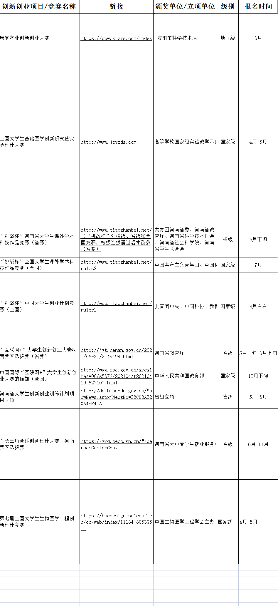 新乡医学院三全学院学生科创竞赛时间、要求一览表.xls