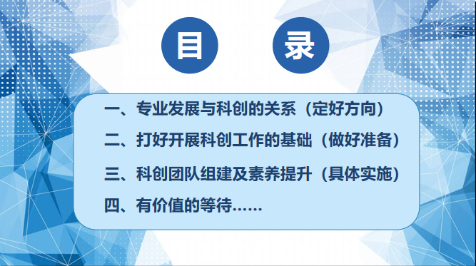 讲座伊始,靳瑞霞首先从专业发展与科创的关系出发,为学生讲解了在科创竞赛具体实施方法中的申报过程以及注意事项,她指出必须要打好开展科创工作的基础,同时,她强调竞赛准备过程团队协作的重要性,最后她指出在科创过程中要把注意力放在积极的事情上,学会体会过程,最终才能获得最佳发展和自我实现。