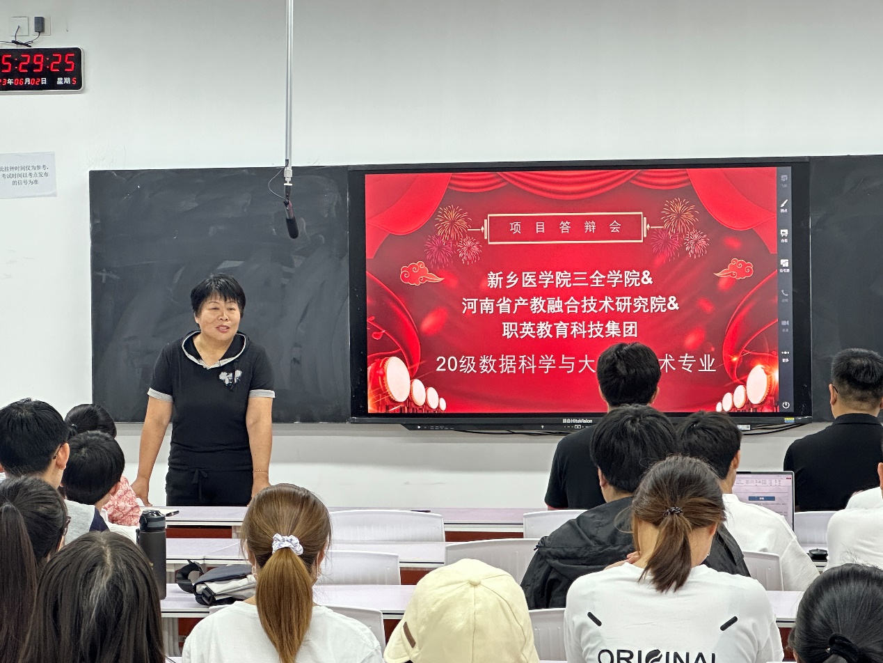 此次实训结果验收采用了项目答辩的形式开展,答辩活动邀请智能医学工程学院副院长靳瑞霞、河南省产教融合技术研究院韩兰英院长和职英教育科技集团张沛杰校长莅临参加。答辩伊始,靳瑞霞发表了开场致辞,她表示很荣幸与职英开展实训赋能的合作,期待实现长期密切的交流与合作。韩兰英院长对于同学们勤奋努力的学习态度也给予了高度肯定,建议同学们能够多把平时学到的专业知识转化到实践上去,通过实训答辩展示自己,争取在未来的职业生涯中争光添彩。