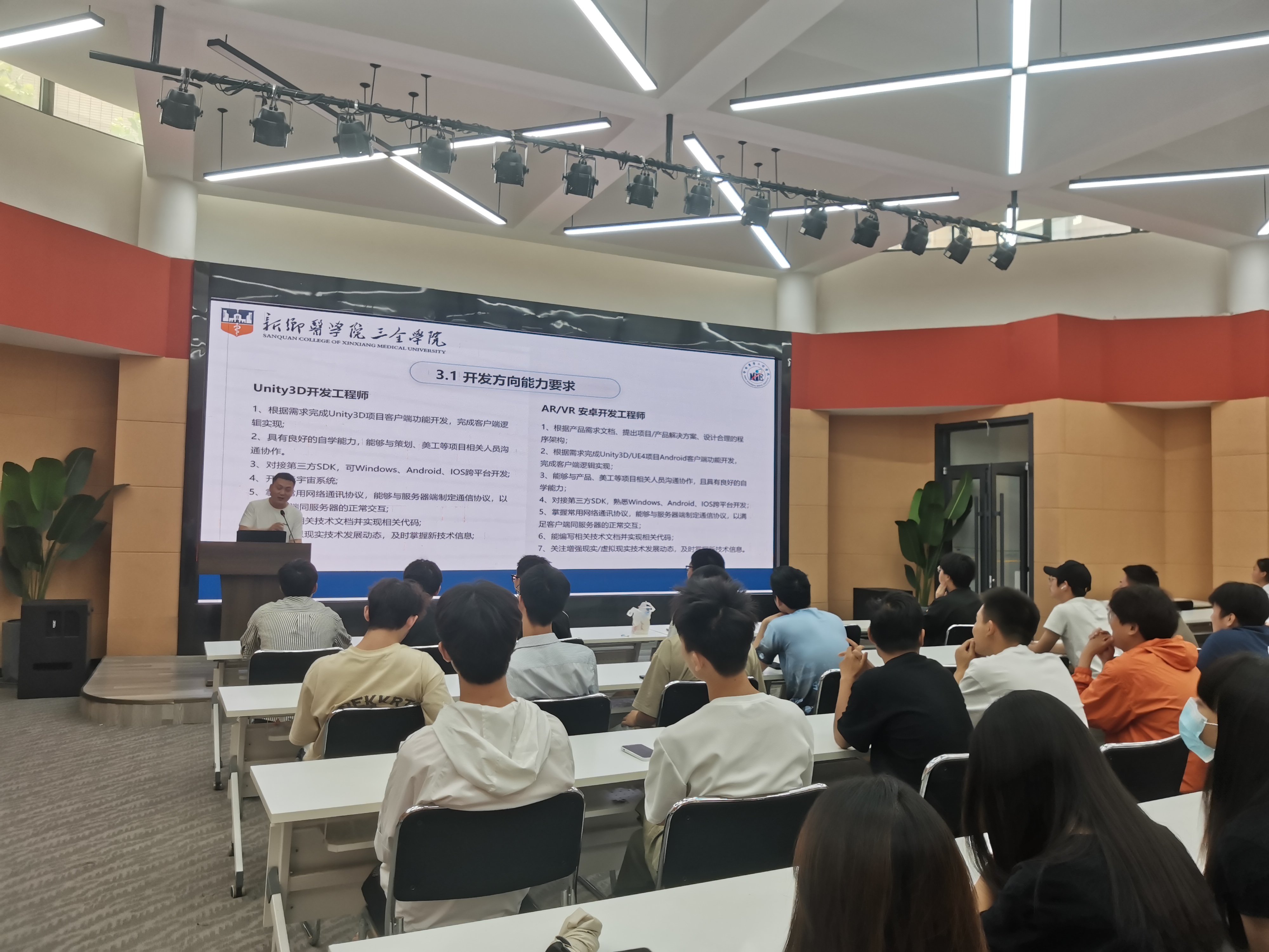 接下来是开发方向的宣讲环节。开发方向的教师代表李祥老师介绍了该方向的学习内容和就业方向。他详细解释了虚拟现实编程、交互设计和虚拟现实引擎等课程的重要性,并强调了虚拟现实软件开发和虚拟现实应用程序设计等领域的就业需求。