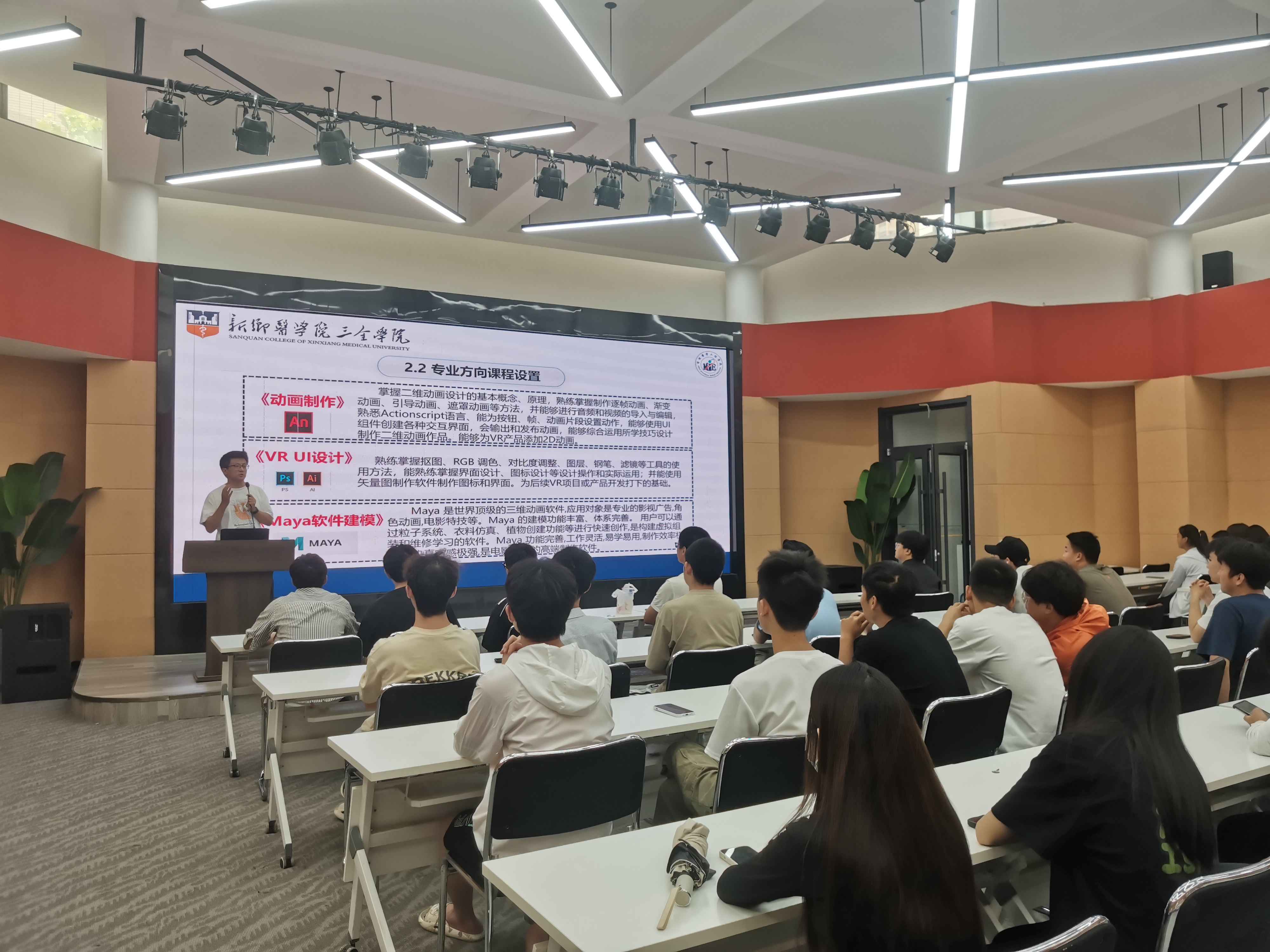 随后,进入美术设计方向宣讲环节。美术设计方向的教师代表王鑫老师详细介绍了该方向的学习内容和就业方向。他强调了平面设计、3D建模和动画制作等课程的重要性,并且提到了虚拟现实游戏、虚拟现实电影等领域的就业潜力。