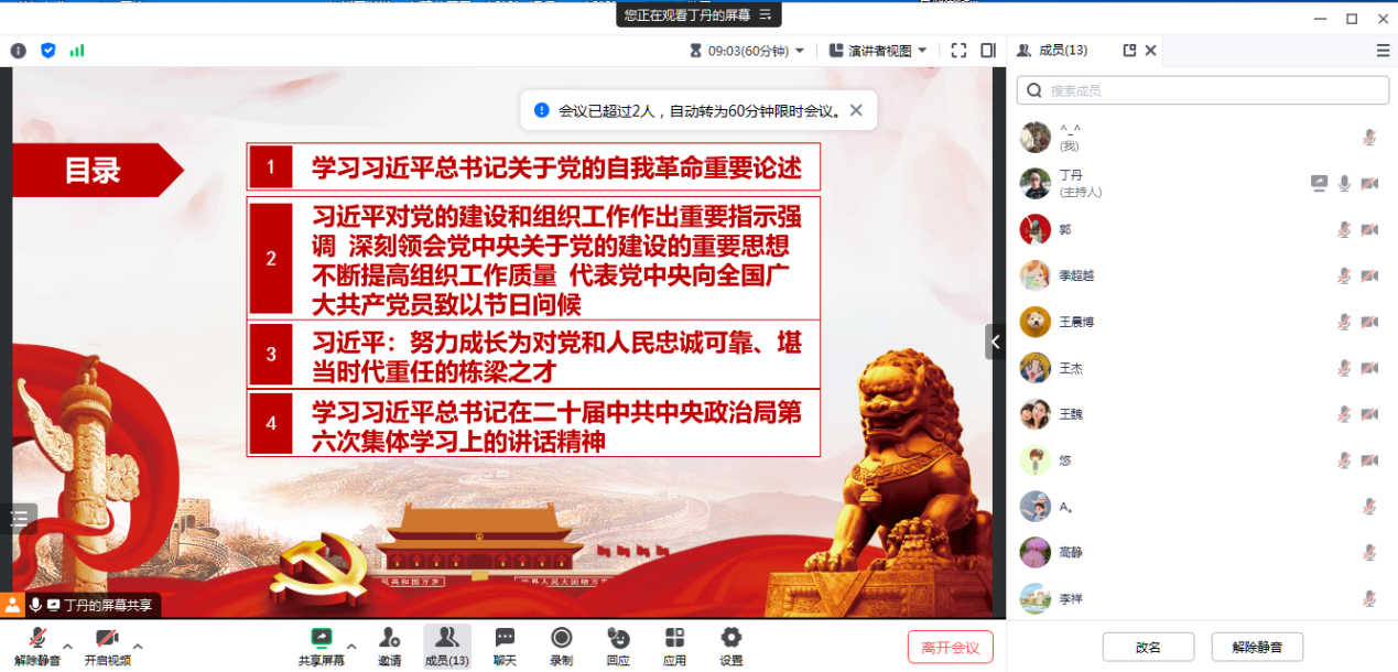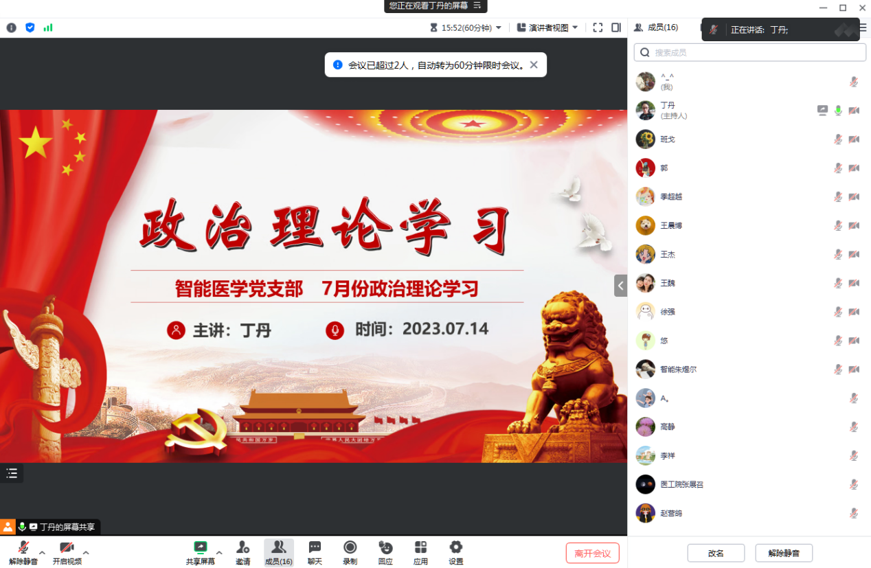 2023年7月14日上午,在支部书记丁丹的组织下,智能医学党支部党员和积极分子以“牢牢把握目标要求,推动主题教育走深走实”为主题,借助腾讯会议召开了7月份的主题党日活动以及政治理论学习。