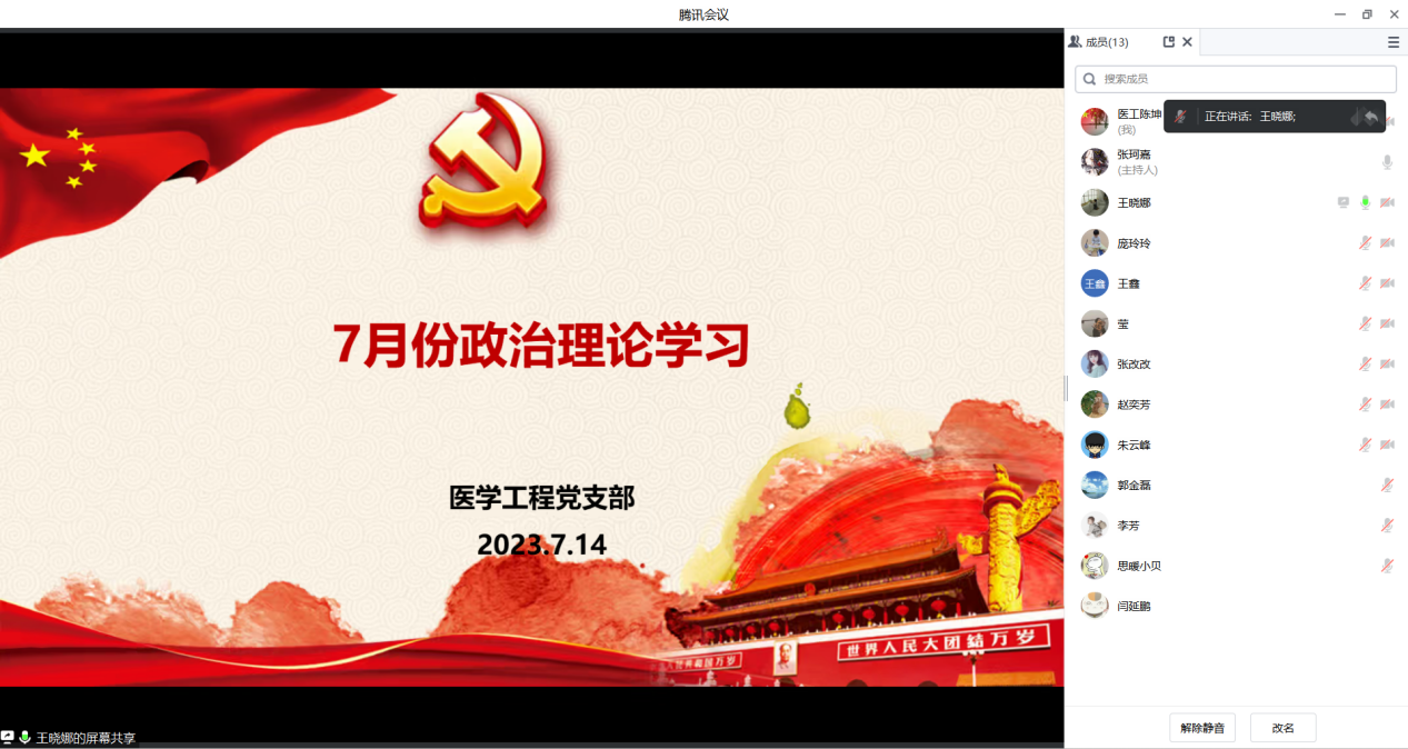 2023年7月14日下午,医学工程党支部以腾讯会议的形式开展了主题为“牢牢把握目标要求 推动主题教育走深走实”的主题党日活动,并在此基础上按照学校要求,组织开展了7月份政治理论学习活动,会议由支部书记王晓娜主持,全体党员参加会议并进行集中学习。