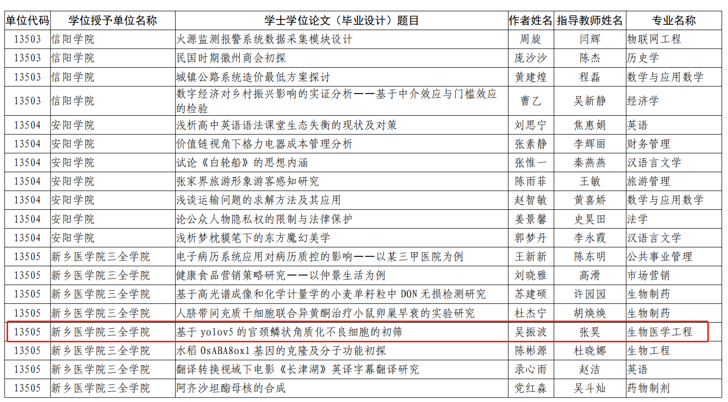 近日,河南省教育厅和河南省学位委员会公布了2022 年河南省优秀学位论文评选结果,经学校遴选推荐,通过同行专家通讯评议,我院张昊老师指导的2022届生物医学工程专业毕业生吴振波同学的毕业论文《基于 yolov5 的宫颈鳞状角质化不良细胞的初筛》被评为2022 年河南省优秀学士学位论文(设计)。