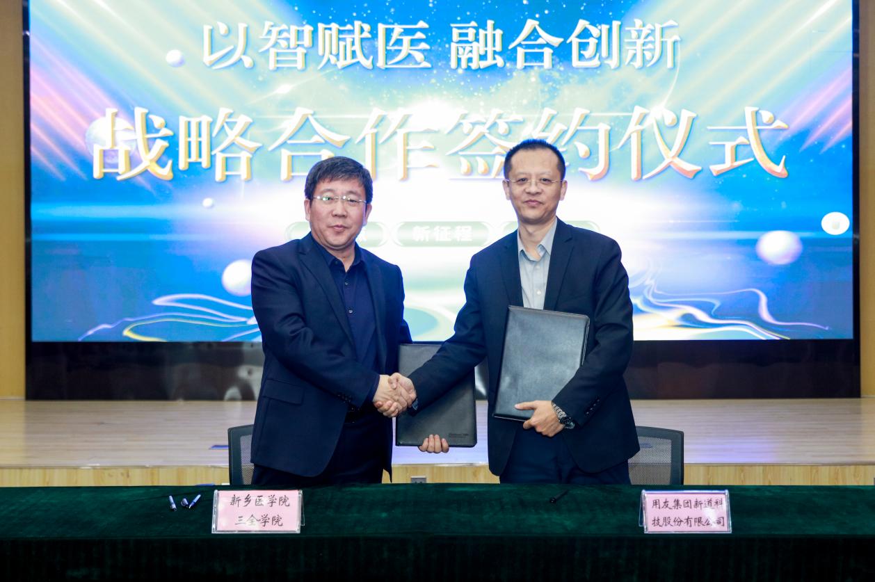 紧接着,校企双方在行政楼三楼学术报告厅举行了“以智赋医 融合创新”战略合作签约仪式。首先秦国亮致词,韩玉民介绍了智能医学工程学院近年建设成效与校企合作情况。随后秦国亮依次与8家企业签署战略合作协议,并授予“新乡医学院三全学院产教融合基地”牌匾。
