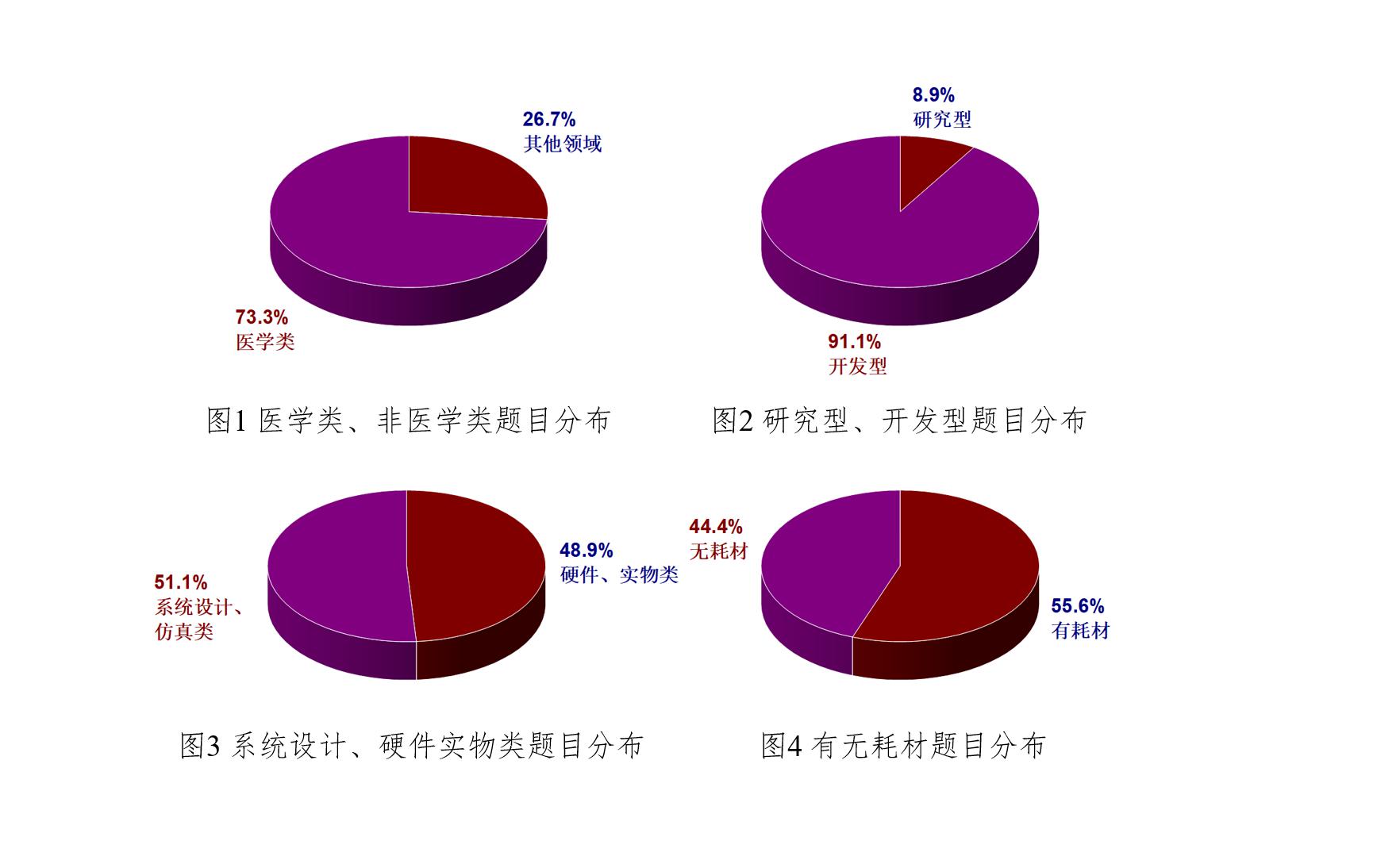 2025年1月,开题答辩以线上形式启动,45名学生分三组通过屏幕共享汇报设计规划,最终全体学生均通过答辩。本届毕业设计题目凸显“一人一题”原则,覆盖医疗设备研发、生物传感器设计等多领域,其中医学类题目占比73.3%,开发型题目占比91.1%,硬件实物类与系统设计类题目合计占比超50%,体现了“理论与实践结合”的培养导向。部分设计涉及耗材应用,兼顾科研创新与工程实用性,充分展现了生物医学工程学科的交叉融合特色。