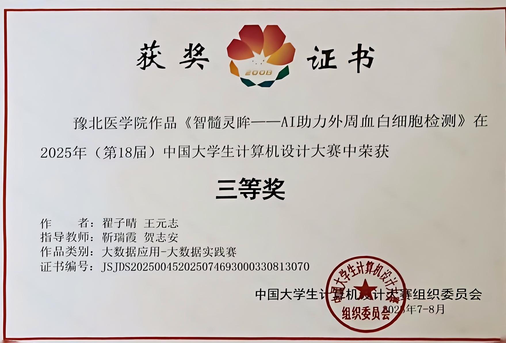 7月23日,2025年(第18届)中国大学生计算机设计大赛决赛结果揭晓。我院新瑞霞、医学检验学院贺志安老师指导的医学检验技术专业学生翟子晴、王元志团队参赛作品《智髓灵眸——AI助力外周血白细胞检测》,荣获全国三等奖(大数据应用-大数据实践赛道)。