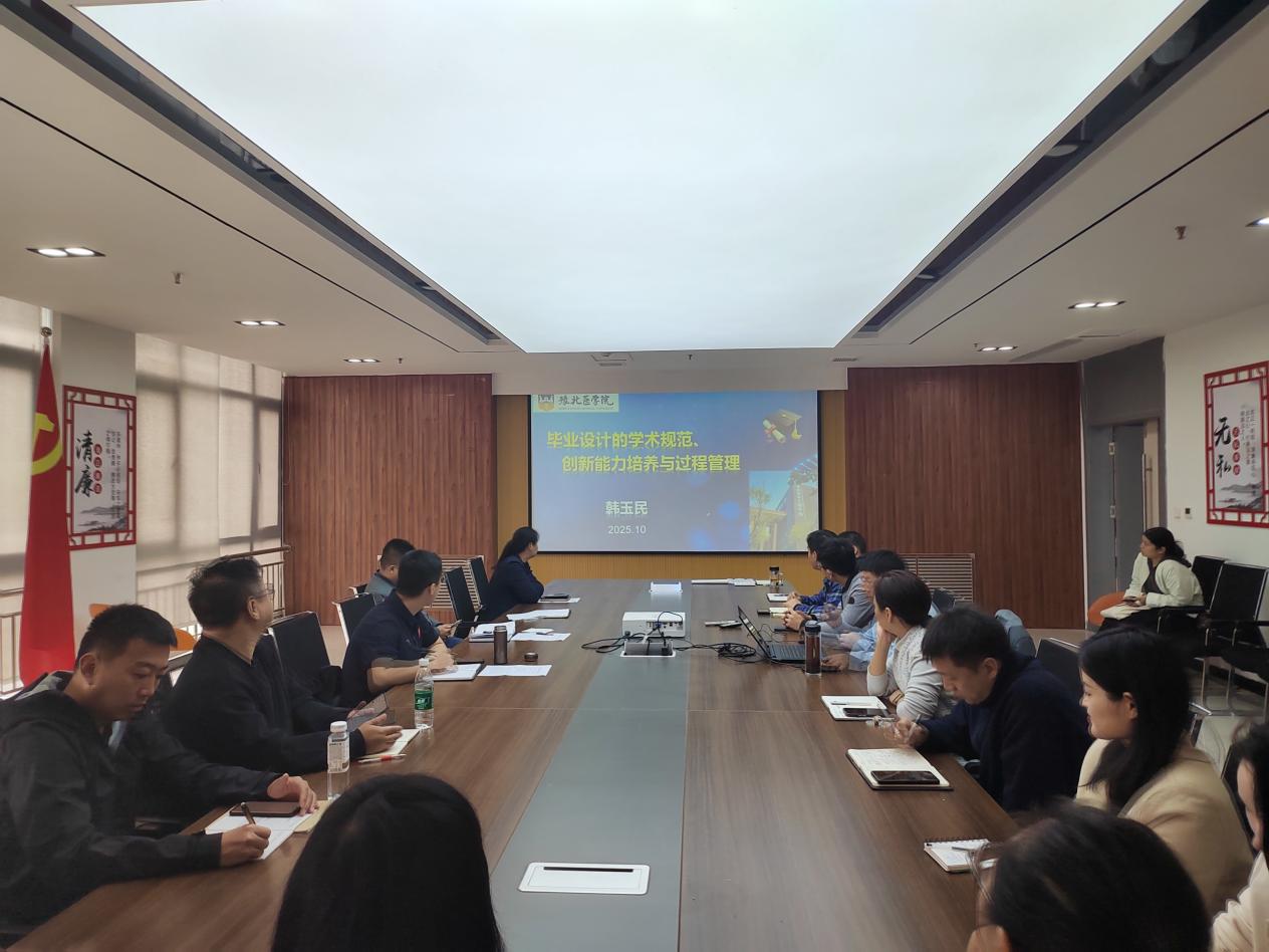 为进一步落实教育部《关于加快建设高水平本科教育全面提高人才培养能力的意见》文件,提升毕业设计质量,10月16日,我院在医学工程实训楼四楼会议室举办了2025年度经验专题介绍暨毕业设计研讨活动,院长韩玉民做了题为《毕业设计的学术规范、创新能力培养与过程管理》专题经验分享。