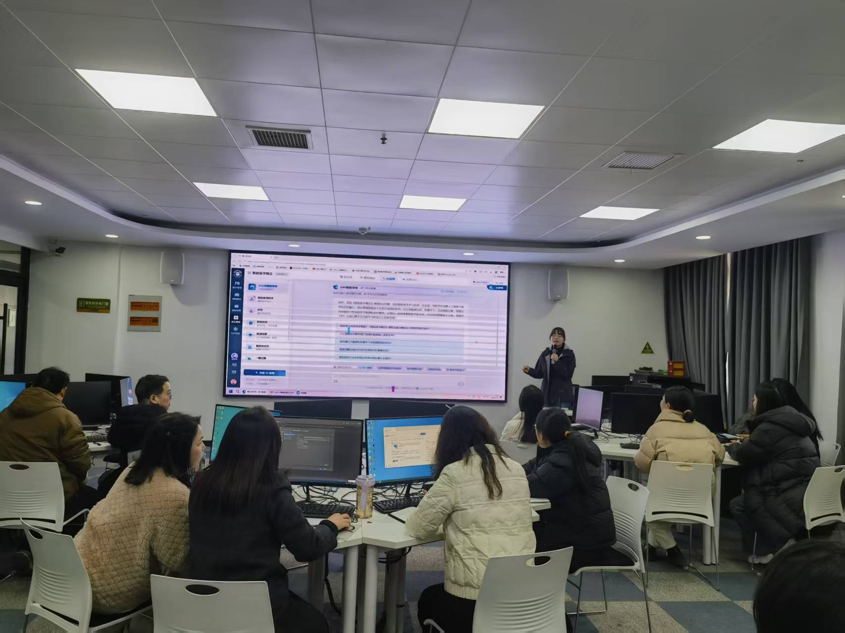 培训环节,陈丹阳老师围绕雨课堂AI模块功能应用展开系统讲解,结合《智能医学概论》课程教学场景,现场演示AI备课、智能学情分析、个性化学习推送等核心功能,为提升教师数字化教学能力提供了精准实操指导。学习结束后,参会人员开启分组讨论、集中研讨、成果沉淀的方式,围绕雨课堂AI工具应用、课程资源共享、查看权限设置、课堂互动优化、数据化教学管理等实际问题深入交流、碰撞思路,进一步明晰了技术赋能教学的具体路径与实施举措。