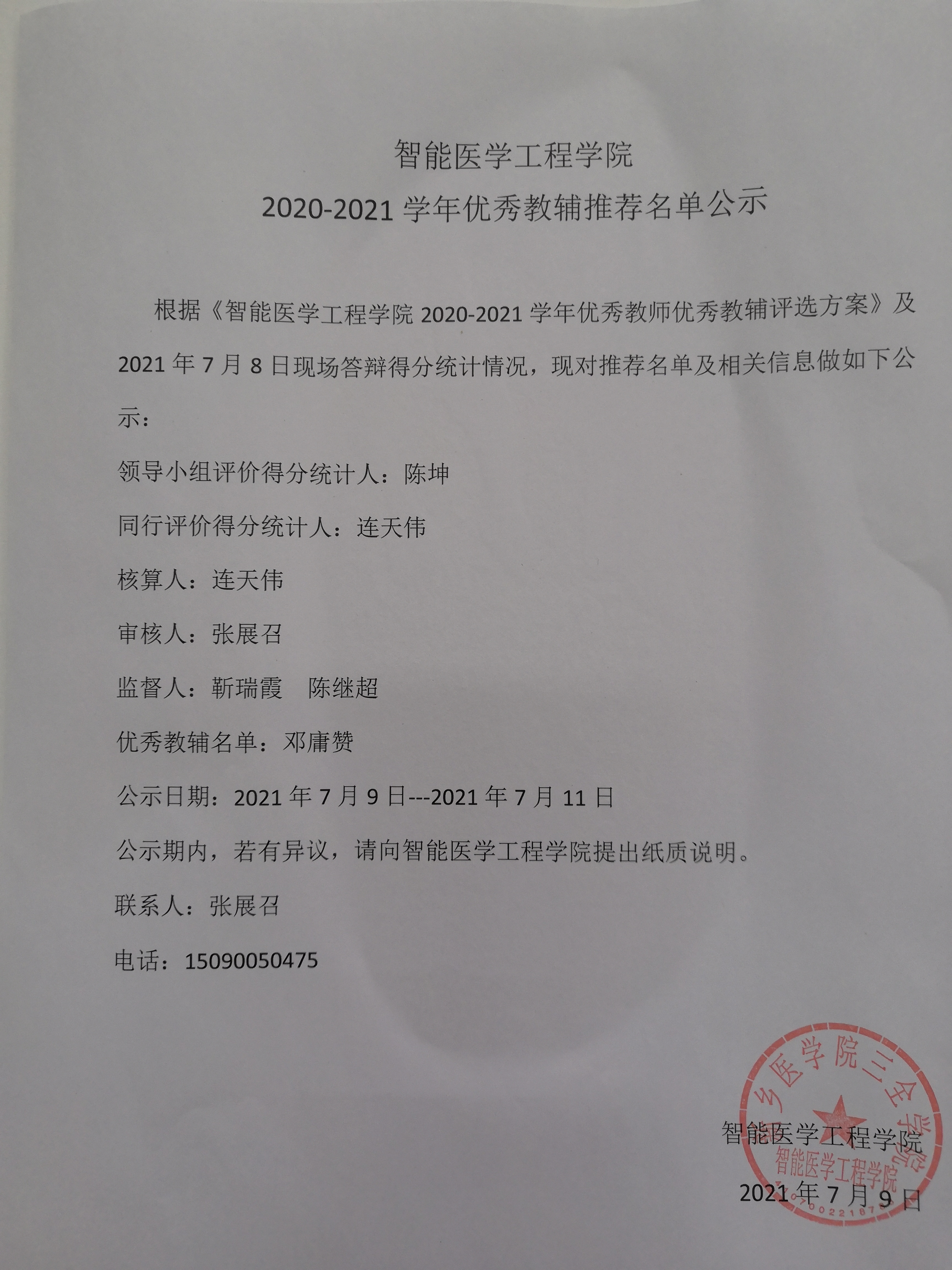 智能医学工程学院2020-2021学年优秀教辅推荐名单公示根据《智能医学工程学院2020-2021学年优秀教师优秀教辅评选方案》及2021年7月8日现场答辩得分统计情况,现对推荐名单及相关信息做如下公示:领导小组评...