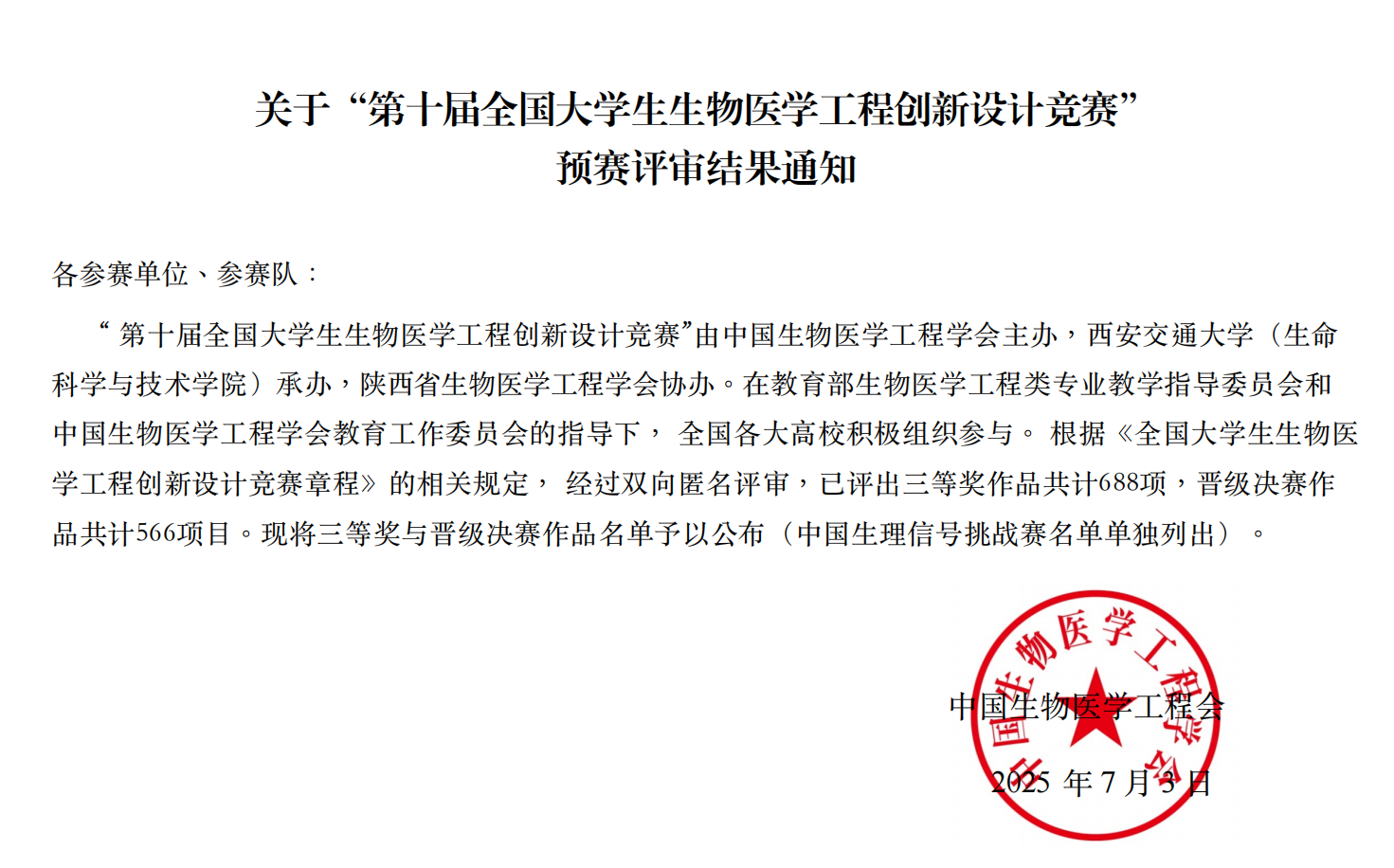 7月20日至22日,由中国生物医学工程学会主办、西安交通大学承办的第十届全国大学生生物医学工程创新设计竞赛决赛在中国西部科技创新港举办。该竞赛全程采用双向匿名评审方式,经过激烈角逐,我校晋级本次...