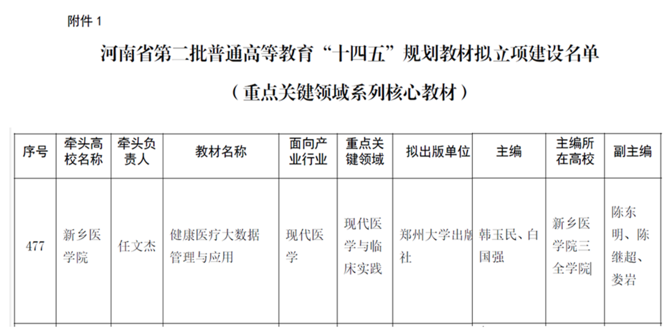 近日,河南省教育厅发布了《河南省教育厅关于河南省第二批普通高等教育“十四五”规划教材拟立项建设名单的公示》,我院1部教材入选河南省第二批普通高等教育“十四五”规划教材(重点关键领域系列核心教...