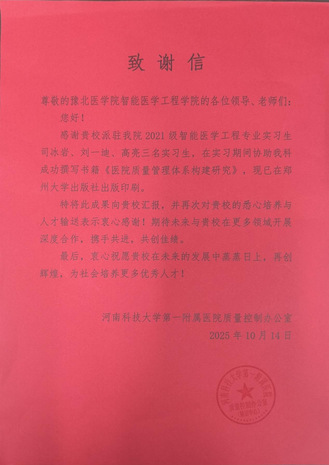 近日,智能医学工程学院收到一封来自河南科技大学第一附属医院质量控...