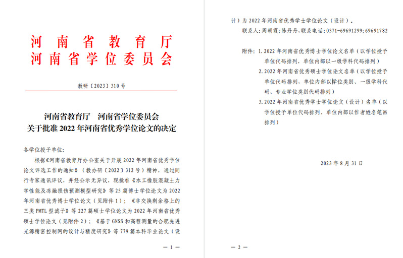 近日,河南省教育厅和河南省学位委员会公布了2022 年河南省优秀学位...