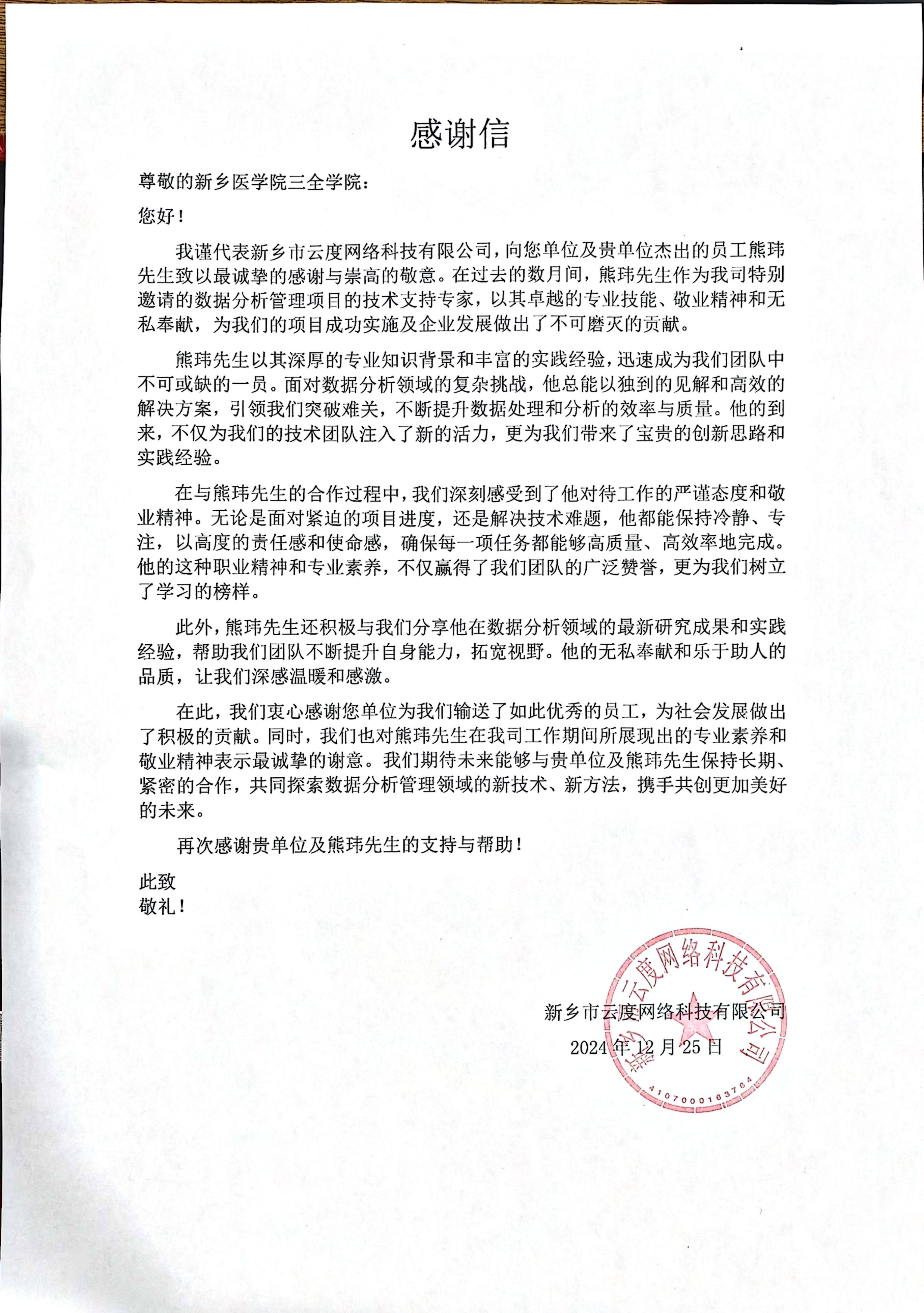 近日,新乡市云度网络科技有限公司向我校发来感谢信,信中高度赞扬了我校智能医学工程学院教师熊玮在参与企业数据分析管理项目中的突出表现,展现了新时代高校教师服务社会的责任担当。据悉,熊玮老师通过...