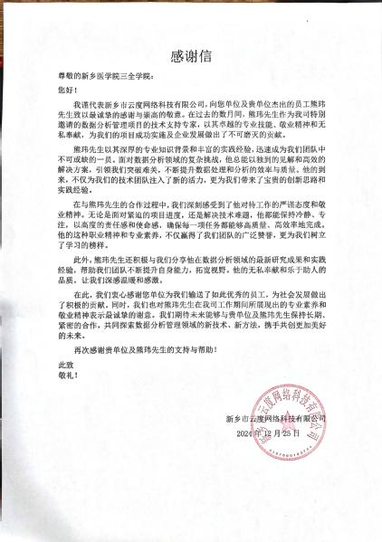 近日,新乡市云度网络科技有限公司向我校发来感谢信,信中高度赞扬了...